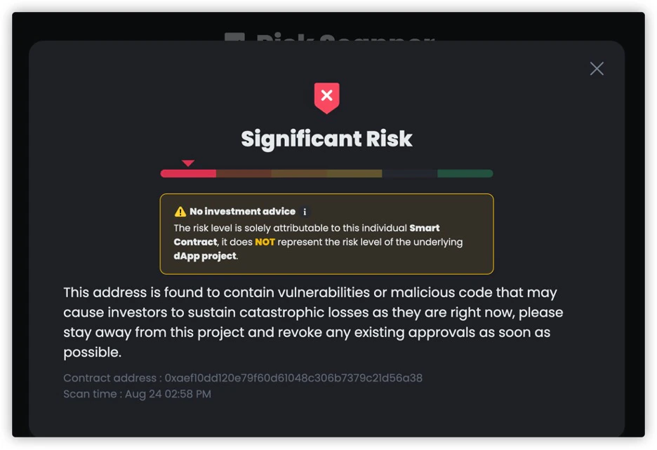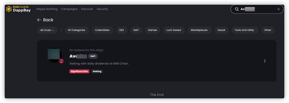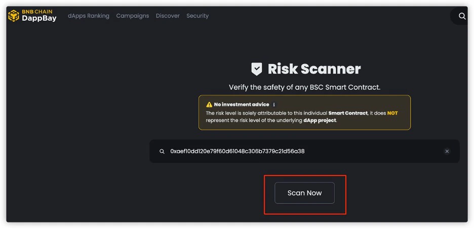 You can also search on the Dappbay website (https://dappbay.bnbchain.org/risk-scanner) based on the Dapp’s name, Twitter, website, etc., to see if the project has been marked as significant risk.