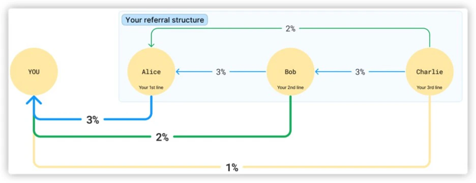 For example, in the contract below, there is a tiered referral reward mechanism, with first, second, and third-level referrers receiving referral rewards at a ratio of 9:2:1.