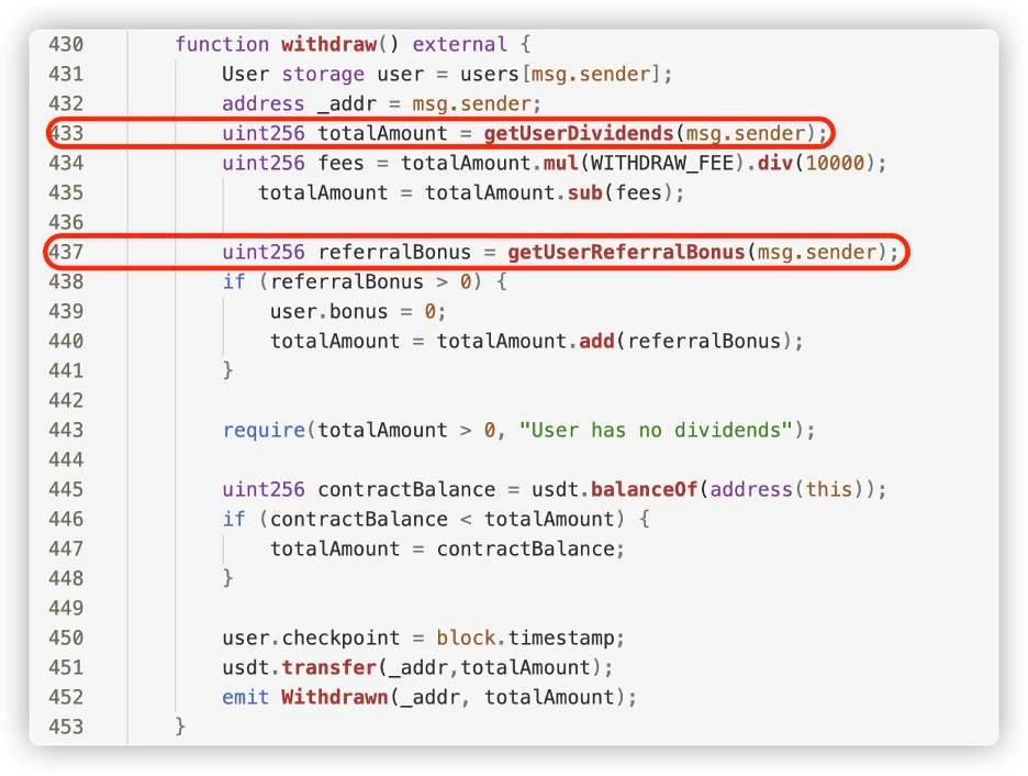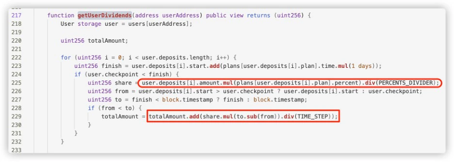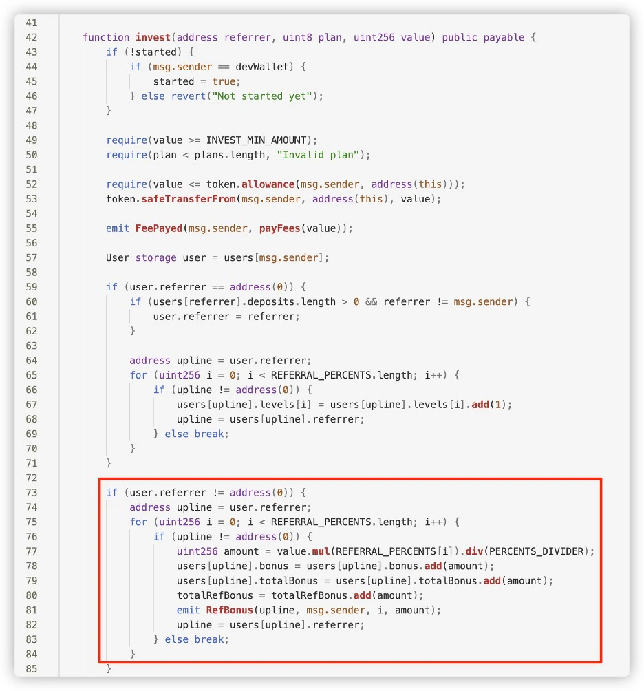Of course, the referral rewards come from the principal investment of later investors. As can be seen, the invest function in the code distributes part of the user’s investment amount to all referrers at their respective levels.