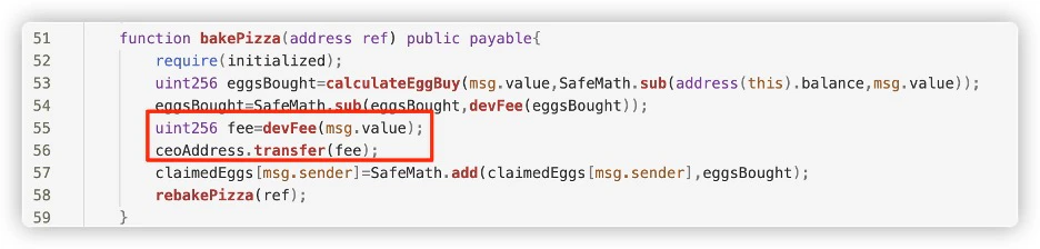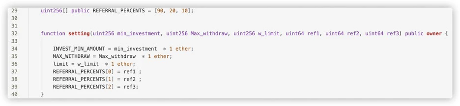 - The code contains logic related to a Referral system. As we mentioned earlier, Ponzi investment smart contracts usually include a referral system, providing users with additional incentives for bringing new users into the scheme.