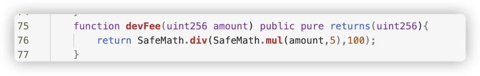- The project party generates revenue by charging tax fees on users’ deposits. For example, in the code below, the project party charges a 5% dev fee on the user’s principal, so they can profit as long as there are new users, regardless of how much money remains in the pool.